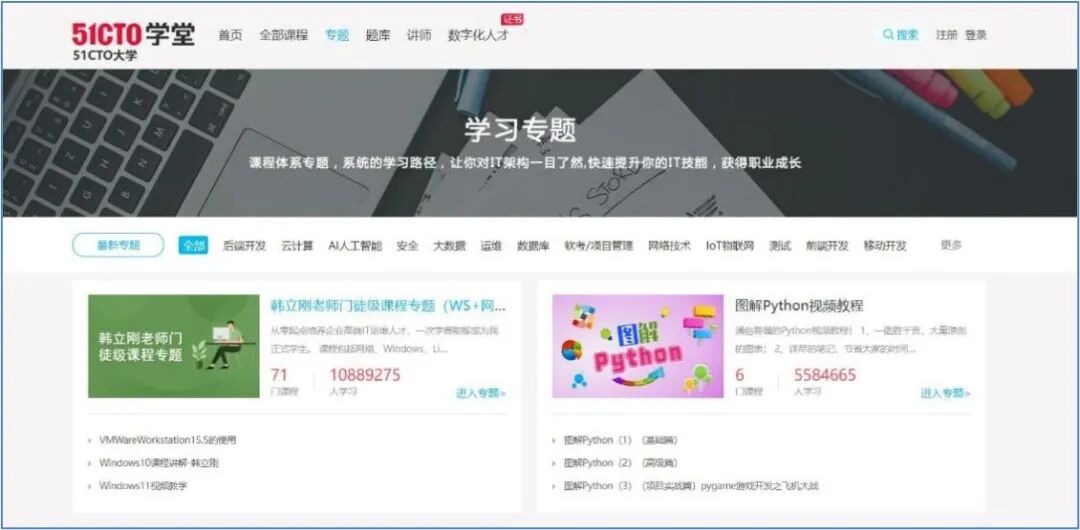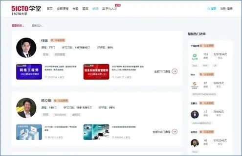 51CTO学堂作为专业的数字化人才学习平台,拥有众多优质、专业并极富实战应用性的自助式培训课程,由数百位优质讲师打造,覆盖后端开发、物联网、运维、云计算、办公软件、网络技术、人工智能等众多主流信息技术领域。
