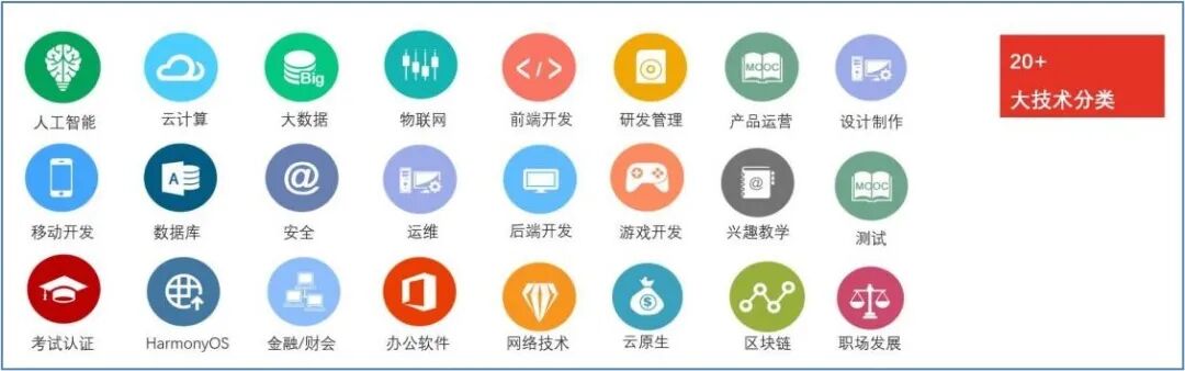 20+大技术分类,100多个细分技术领域的在线课程,简单的、复杂的、专业的、常用的,各种课程应有尽有;