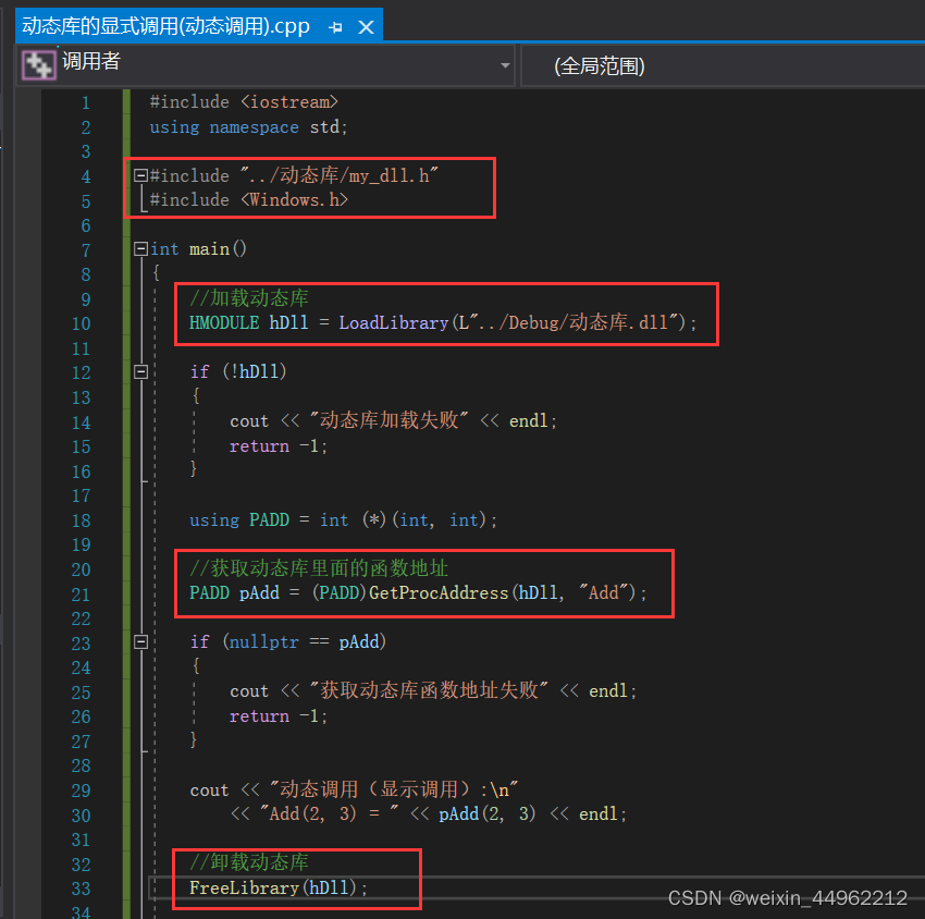 这里需要用到加载、获取动态库函数地址、卸载的函数,包含在Windows.h里
