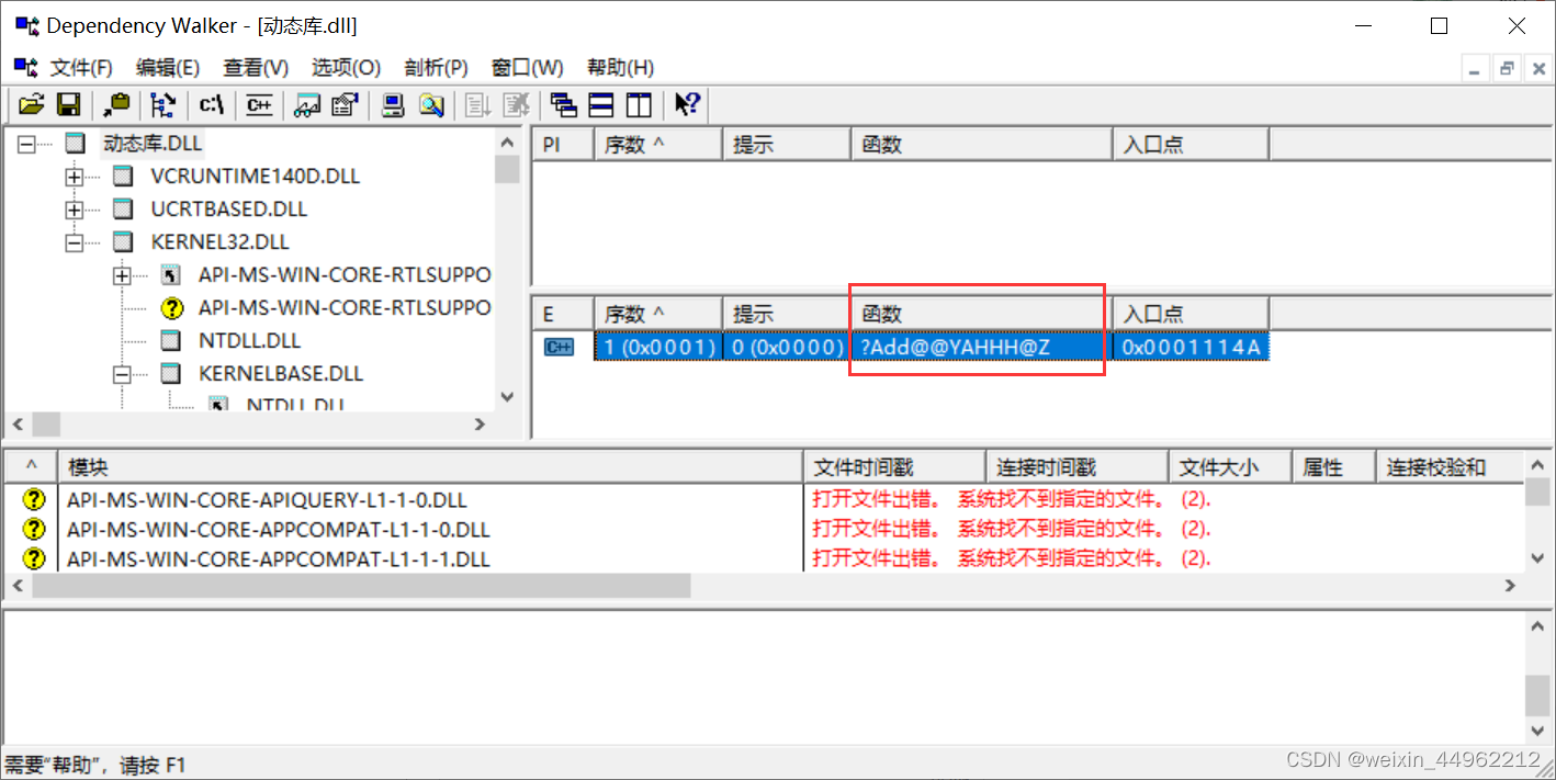 原因是函数的名字在动态库里面并不叫“Add”,我们用depends工具看一下