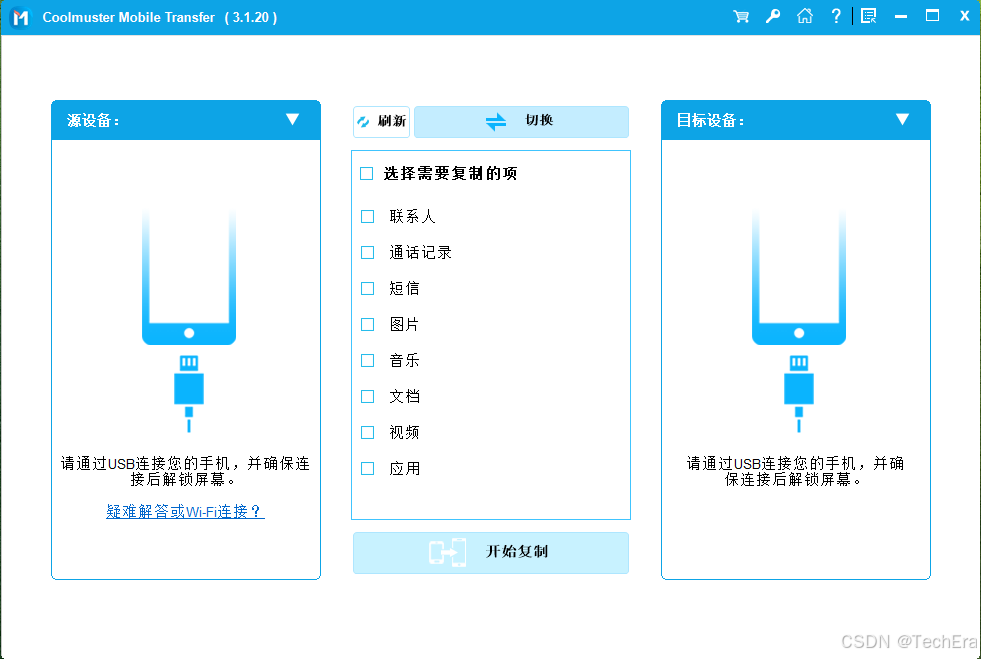 选择要传输的内容。在“选择要复制的内容”下检查您想要的项目,然后点击下面的“开始复制”以开始Mi手机数据传输。