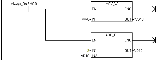 (3)写入指针与指针偏移,写入指针与指针偏移,当执行一次循环VW0值加一,把VW0写入至VD100,当循环一次指针偏移一个双字。