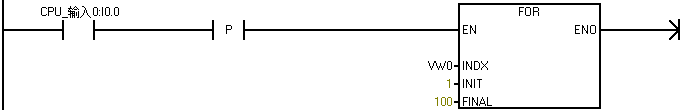 (2)启用FOR循环,EN端使能端不需要一直接通,只需要使用沿脉冲(上升沿)触发,INDX存放于循环次数使用字数据类型表示,INIT表示起始循环次数,FINAL表示结束循环次数。