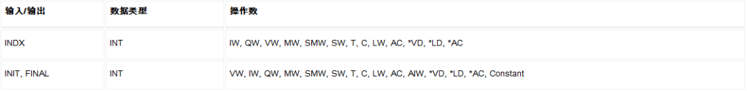 使能输入EN有效,循环体开始执行,执行到NEXT指令时返回,每执行一次循环体,当前值计数器INDX增1,达到终止值FINAL时,循环结束。