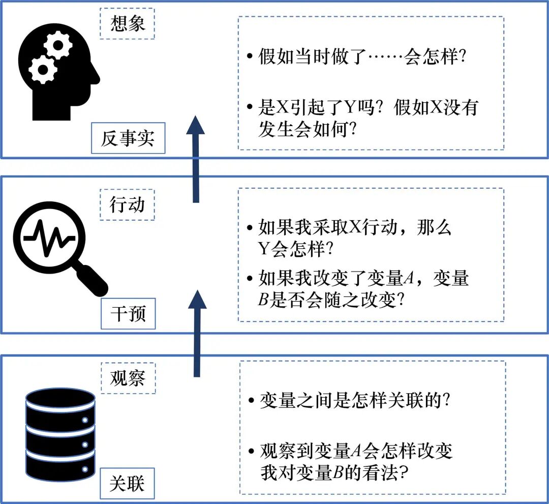 反事实推理又称反事实思维,指对过去已经发生的事实进行否定和重新表征,构建一种可能性假设的思维活动。反事实逻辑推理能力是人类智能的重要表现之一,在当前人工智能的研究热潮中,研究者们意识到,具有像人类一样的因果推断和反事实推理的能力,是从弱人工智能走向强人工智能的象征。因果关系具有自下而上的3个层次,分别是关联、干预和反事实。反事实处于“因果关系之梯”的最顶层,如图5所示。