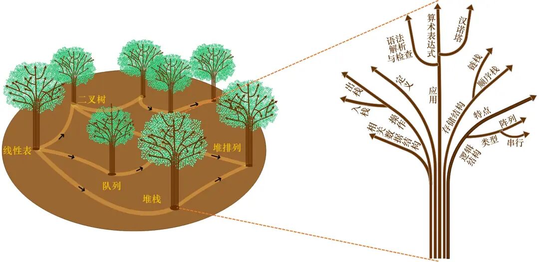 在知识获取的基础上,知识融合的根本性问题在于如何对不同来源的数据进行合并,去除冗余知识,实现对知识的最优整合。为解决这一问题,西安交通大学研究团队提出了一种创新的知识融合模型,即知识森林。如图3所示,知识森林采用“分面聚合”与“导航学习”相结合的策略,形成由主题分面树(右图树形结构)与学习依赖关系(左侧森林中路径)结合的知识层次结构。知识森林的构建包括主题分面树生成、碎片化知识装配、认知关系挖掘3个步骤。其中,分面树生成旨在挖掘领域内具有饱满内容信息的知识主题及其更细粒度的分面结构,可以先通过主题分面联合学习算法生成主题和分面集合,然后基于基序(Motif)结构挖掘每个主题的分面层级结构。碎片化知识装配旨在学习文本、图像等碎片知识和主题分面树的映射关系,形成实例化的主题分面树,以图文并茂的知识表达形式为学习者提供更加全面的主题内容。上述知识森林构建过程可以通过运用自然语言处理、计算机视觉、跨媒体挖掘等技术得以实现。学习依赖关系表现为在学习某项知识主题之前必须要掌握该知识主题的前提知识,这类关系的挖掘可通过分析知识主题的分布特性与语义特性、认知关系的局部性与非对称性来实现。知识森林是一种创新的知识库形态,可为知识检索、智能问答、问题生成等推理任务提供知识支撑,在教育、税务、医疗等多个领域具有应用前景。