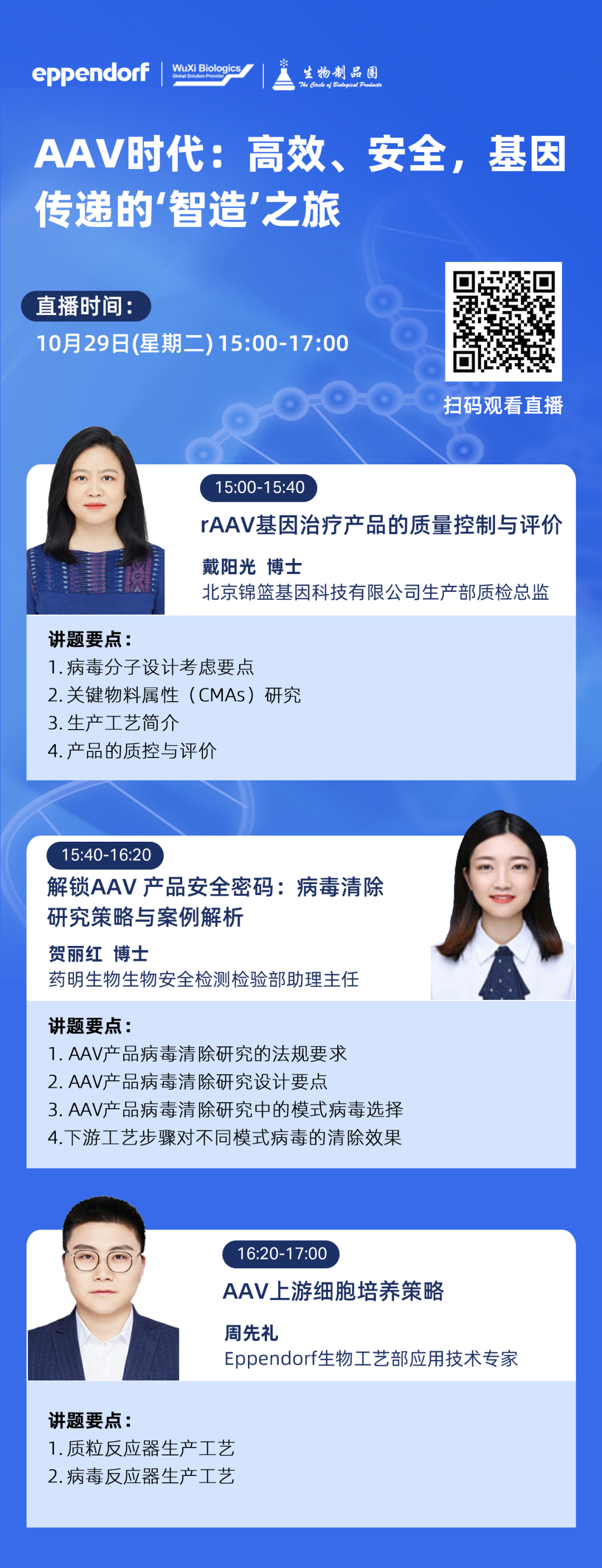 为此,10月29日(周二)15:00-17:00,Eppendorf联合生物制品圈将进行关于“AAV时代:高效、安全,基因传递的‘智造’之旅”的直播分享,本次直播分别邀请了北京锦篮基因科技有限公司生产部质检总监戴阳光博士进行关于“rAAV基因治疗产品的质量控制与评价”、药明生物生物安全检测检验部助理主任贺丽红博士进行关于“解锁AAV产品安全密码:病毒清除研究策略与案例解析”以及Eppendorf生物工艺部应用技术专家周先礼老师进行关于“AAV上游细胞培养策略”的内容分享。希望给业界同仁带来些许启发。