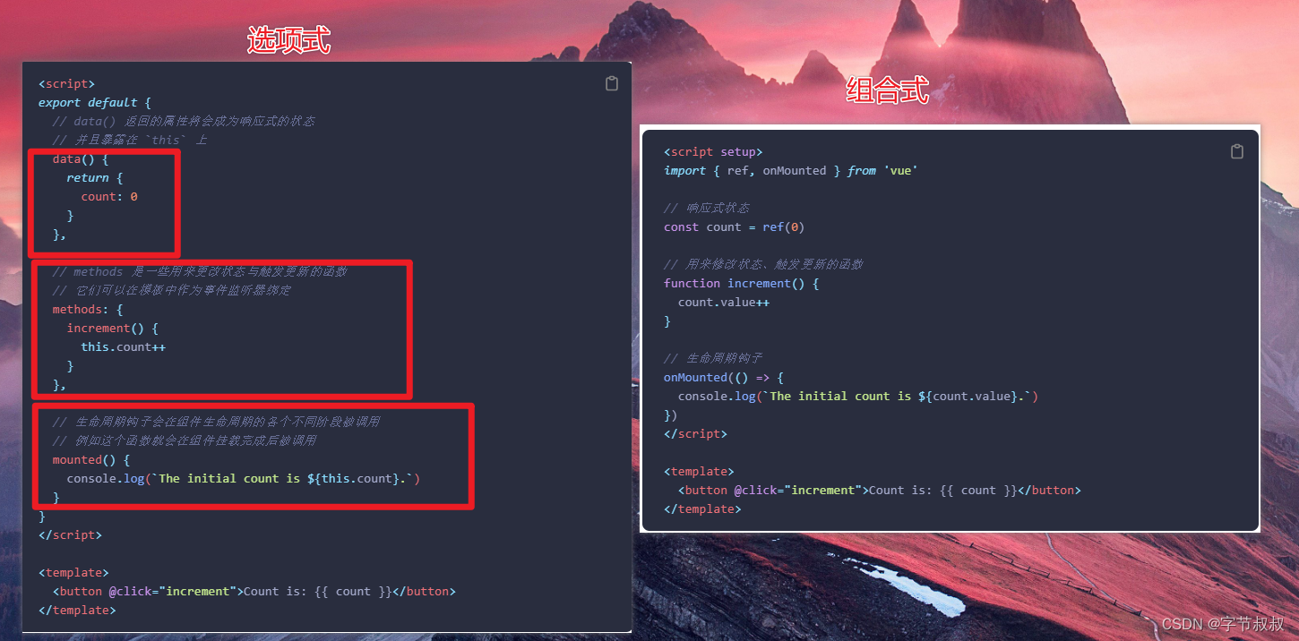 Vue 3 引入了一些新的特性和优化,同时也对一些 API 进行了调整和改进。以下是一些常见的 API 类型的比较: