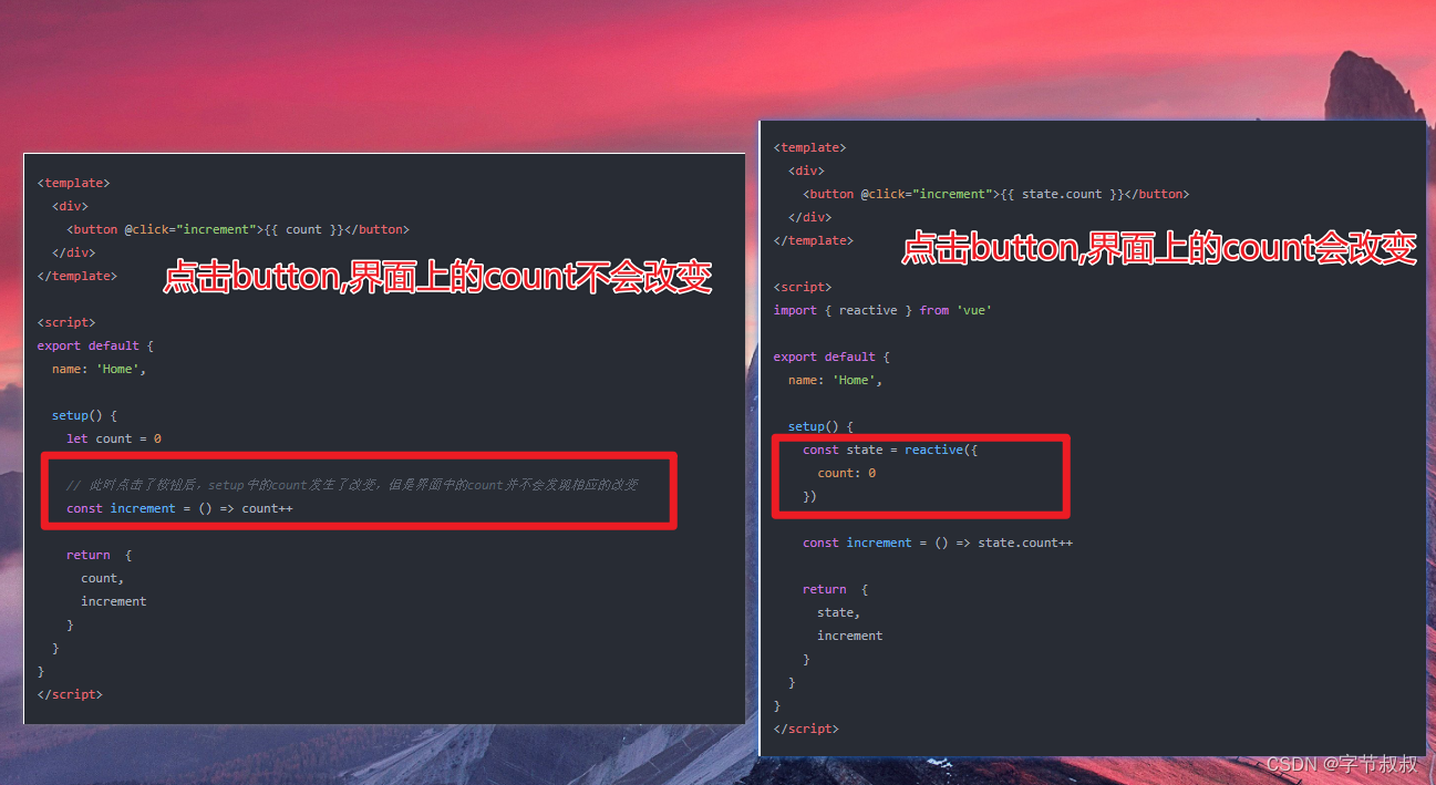 reactive封装的响应式对象,不要通过解构的方式return,这是不具有响应式的。可以通过 toRefs 处理,然后再解构返回,这样才具有响应式