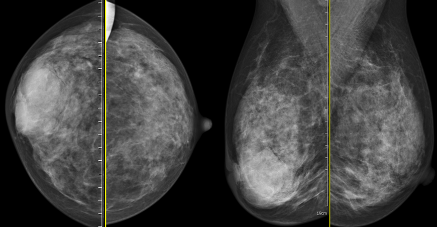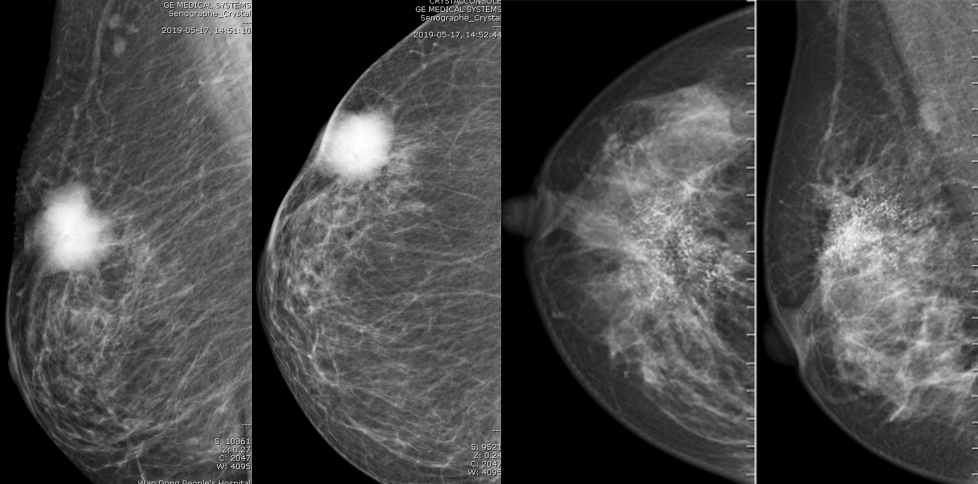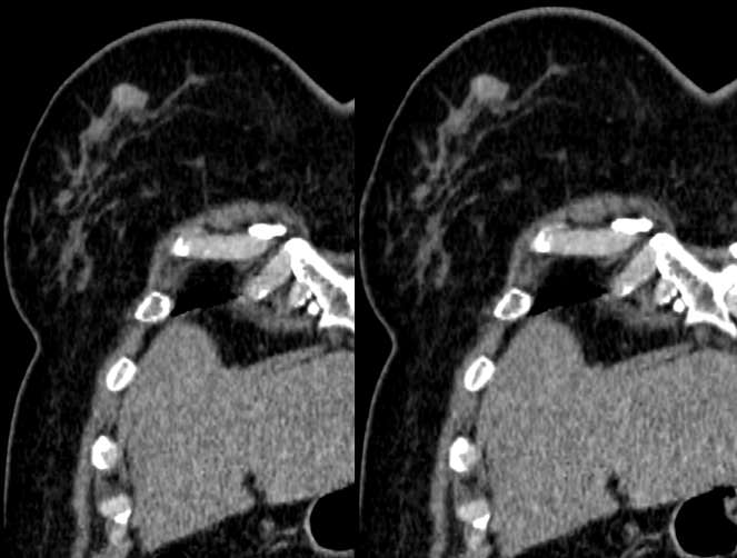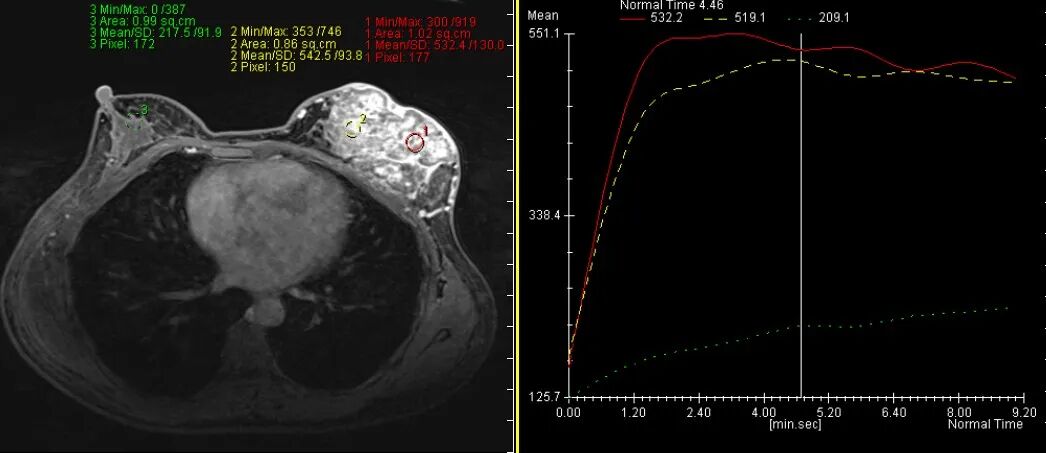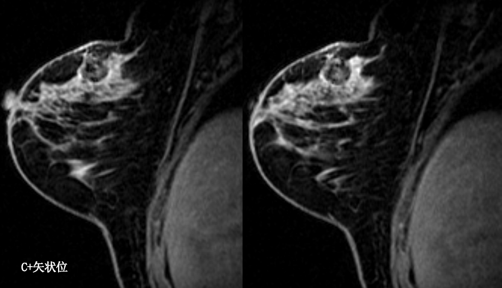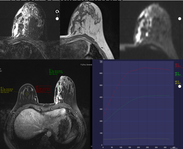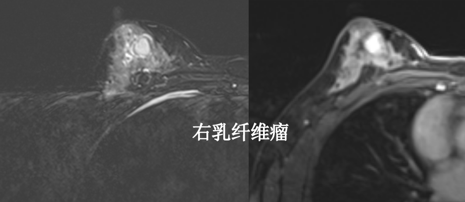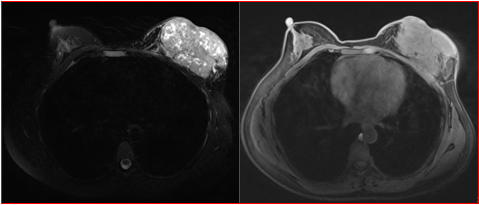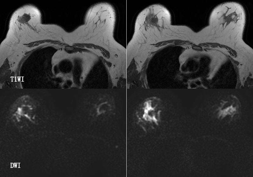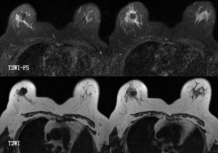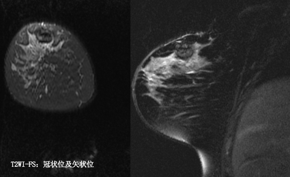 乳腺炎:包括急、慢性乳腺炎和乳腺脓肿,多见于产后哺乳期妇女,急性乳腺炎常有典型的临床症状-红、肿、热、痛;若治疗不及时可形成慢性乳腺炎或乳腺脓肿。MG 表现片状致密影,边缘模糊,患处皮肤水肿增厚,皮下脂肪层模糊;MRI-T1WI 表现为片状低信号,T2WI 高信号,信号强度不均匀,边缘模糊,皮肤水肿、增厚,增强 MRI 通常表现为轻至中度强化,且以延迟强化为主。