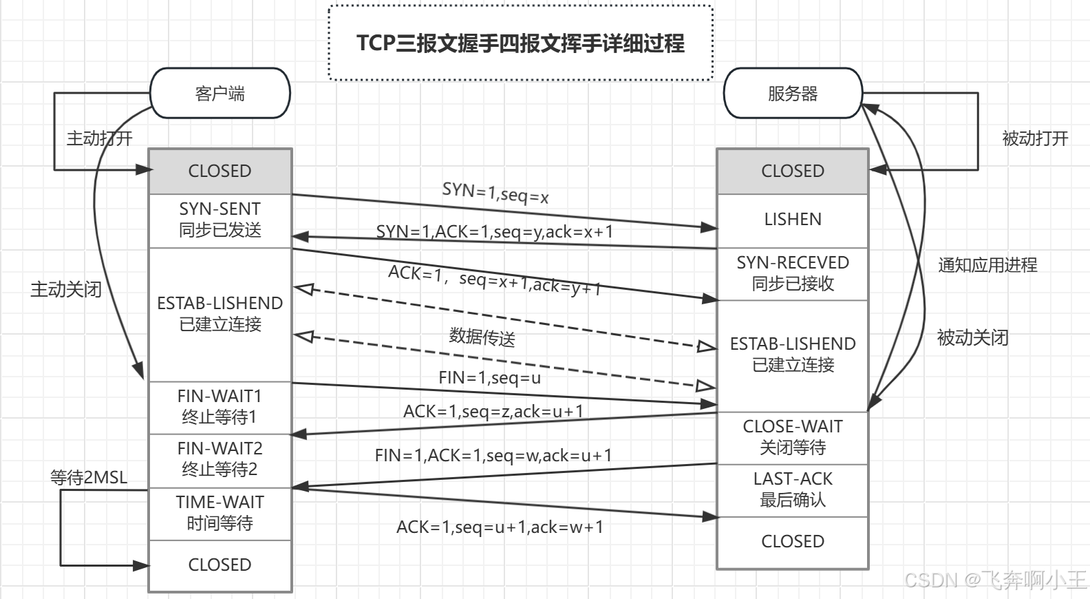 LISHEN:监听状态,等待客户端TCP端口的连接请求