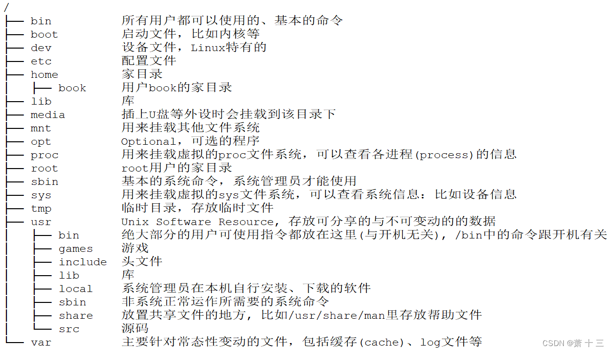 Ubuntu中的目录遵循FHS标准(Filesystem Hierarchy Standard,文件系统层次标准)。它定义了文件系统中目录、文件分类存放的原则、定义了系统运行所需的最小文件、目录的集合,并列举了不遵循这些原则的例外情况及其原因。FHS并不是一个强制的标准,但是大多的Linux、Unix发行版本遵循FHS。