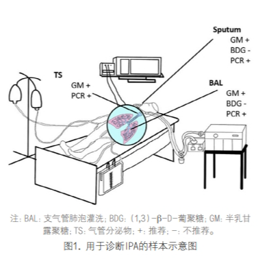 1. (1,3)-β-D-葡聚糖:它与基于培养的方法 相比,非基于培养的方法(例如GM和BDG)可减少鉴 定IPA 所需的时间,尽管建议将血清和BAL样本中的 GM作为早期检测IPA的可靠标志物,但EORTC/MSG对侵 袭性真菌病(IFD)的共识定义将BDG列为真菌学证 据,但不建议将其用于临床试验或定义IPA,因为BDG 对任何侵袭性真菌疾病都没有特异性。对于BAL等其 他样本,数据各不相同,也没有组织或联盟提出官方 建议。BDG是大多数医学上重要真菌的主要细胞壁成 分,在IFD期间,被释放到血液和组织中。隐球菌、 接合菌(犁头霉、毛霉和根霉)和皮炎芽生菌除外, 这些菌含量很少或不含BDG,因此,在感染这些真菌 时检测不到葡聚糖。在2016年的一项荟萃分析中,Shi 等人报告称,BAL BDG检测的灵敏度和特异性远低于血 清BDG(分别为52%和58%),且具有高度异质性的局 限性。研究队列包括接受和不接受免疫抑制的患者以 及来自ICU和普通病房的患者,即使在排除异常研究 并重新评估后,性能特征仍然很差(灵敏度为45%, 特异性为62%)。