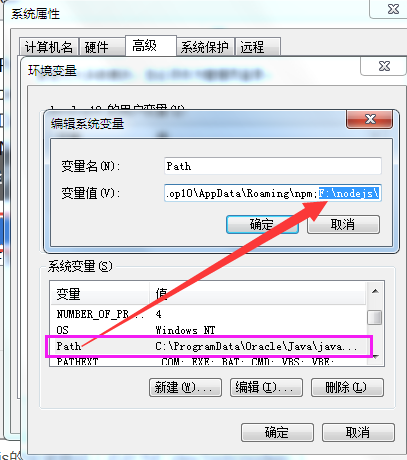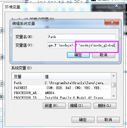 注意:由于 node 全局模块大多数都是可以通过命令行访问的,还要把【node_global】的路径“E:devTools odejs ode_global”加入到【系统变量 】下的【PATH】 变量中,方便直接使用命令行运行,如下图所示: