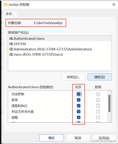 是由于对文件夹操作的权限不够,右击Nodejs文件夹->属性->安全,点击编辑,将所有权限都✔即可。