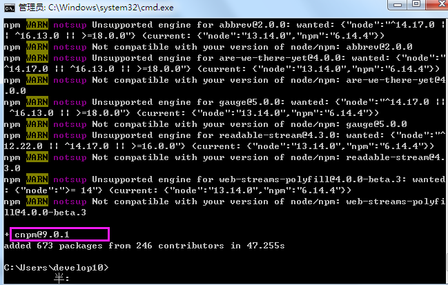 住:如果将npm默认的registry修改为淘宝registry后,使用npm下载时就会使用国内的淘宝镜像,如果大家安装cnpm遇到报错或者安装后仍然有问题,就可以不用再安装cnpm了,npm淘宝镜像和cnpm两种方案选择其一即可。
