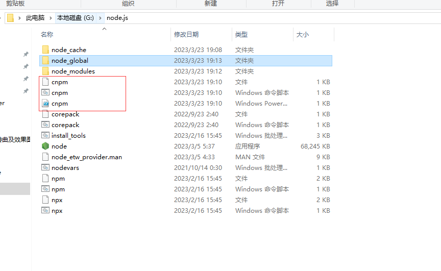 注意:“-g”等同于“–global”,“-g” 是全局安装,不加“-g”就是默认下载到当前目录。“-g” 表示安装到之前设置的【node_global】目录下,同时nodejs会自动地在node_global文件夹下创建【node_modules】子文件夹