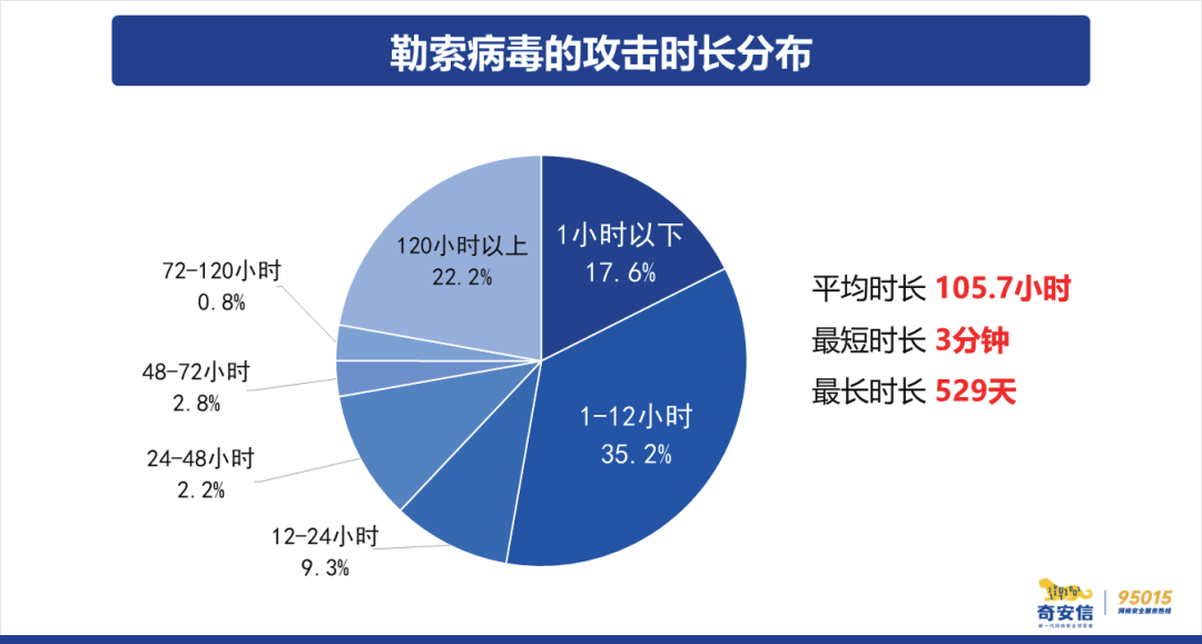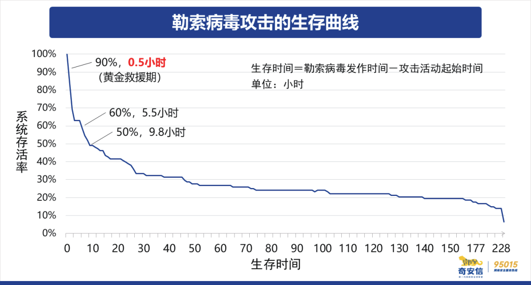 勒索病毒的攻击是一个过程,而不是瞬时动作。有效的安全监测和实战化的安全运营完全有能力及时发现和阻止勒索病毒攻击。为了能够更加精确地分析防范勒索病毒攻击所需的响应速度,基于“攻击时长”数据绘制了勒索病毒攻击的“生存曲线”,如图3所示。