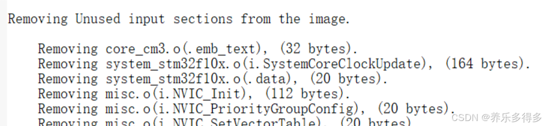 这个就是移除掉没有使用到的东西,比如我们为了方便,会把所有的库函数都加入到工程中,但可能有的库函数模块没有使用掉,对这部分进行移除,最后是一段总结性的文字,总计501未调用的模块共21820字节从映像文件中移除