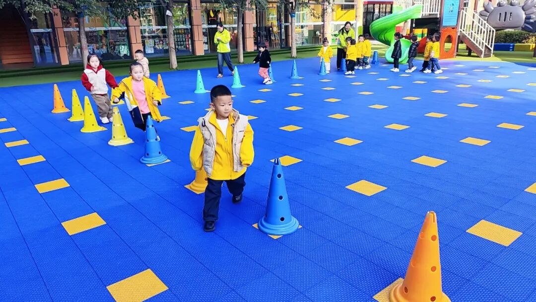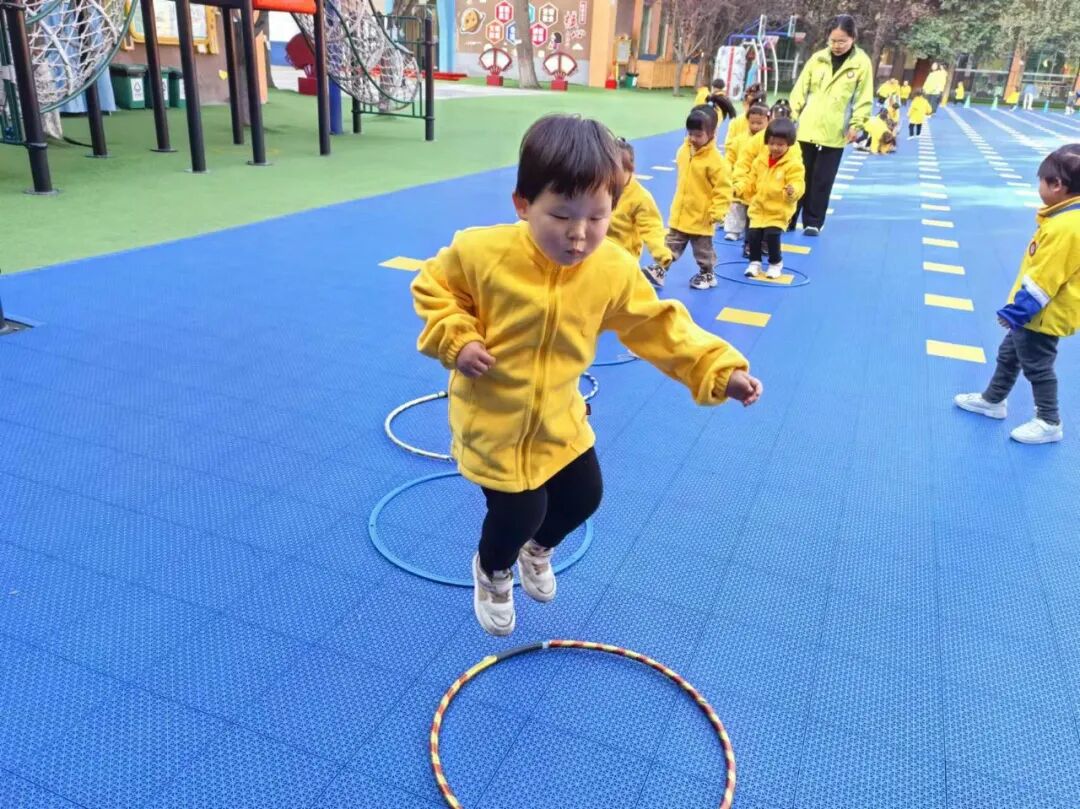 幼儿关键经验:双脚并拢向前跳跃,提高腿部肌肉力量和对空间方位的感知。