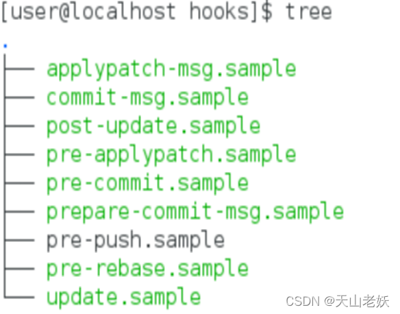 Git钩子都被存储在Git仓库目录(.git)下的hooks子目录中。当git init初始化一个新版本库时,Git 默认会在hooks目录中放置一些示例脚本。示例脚本除了本身可以被调用外,还透露了被触发时所传入的参数。所有的示例脚本都是shell脚本,可以使用Ruby、Python或其它语言编写脚本。