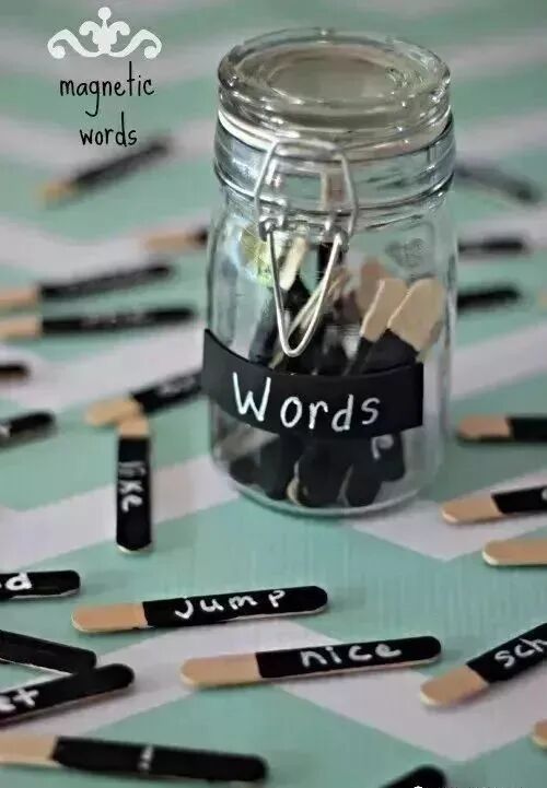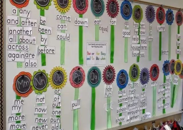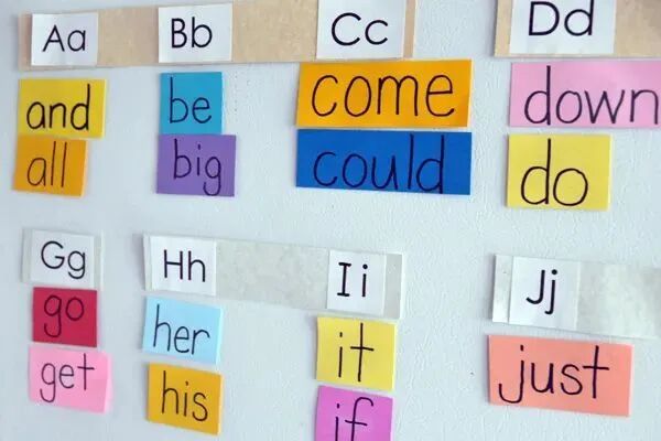 用不同颜色的纸在墙上设置出 26 块区域,以字母 A-Z 分类;遇到任何以那个字母开头的词语,都可以放进去,例如 and 和 all,就放在 a 区域。