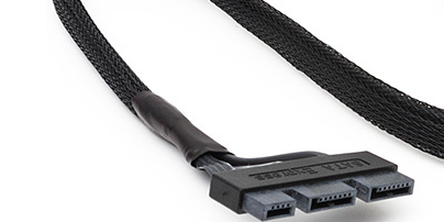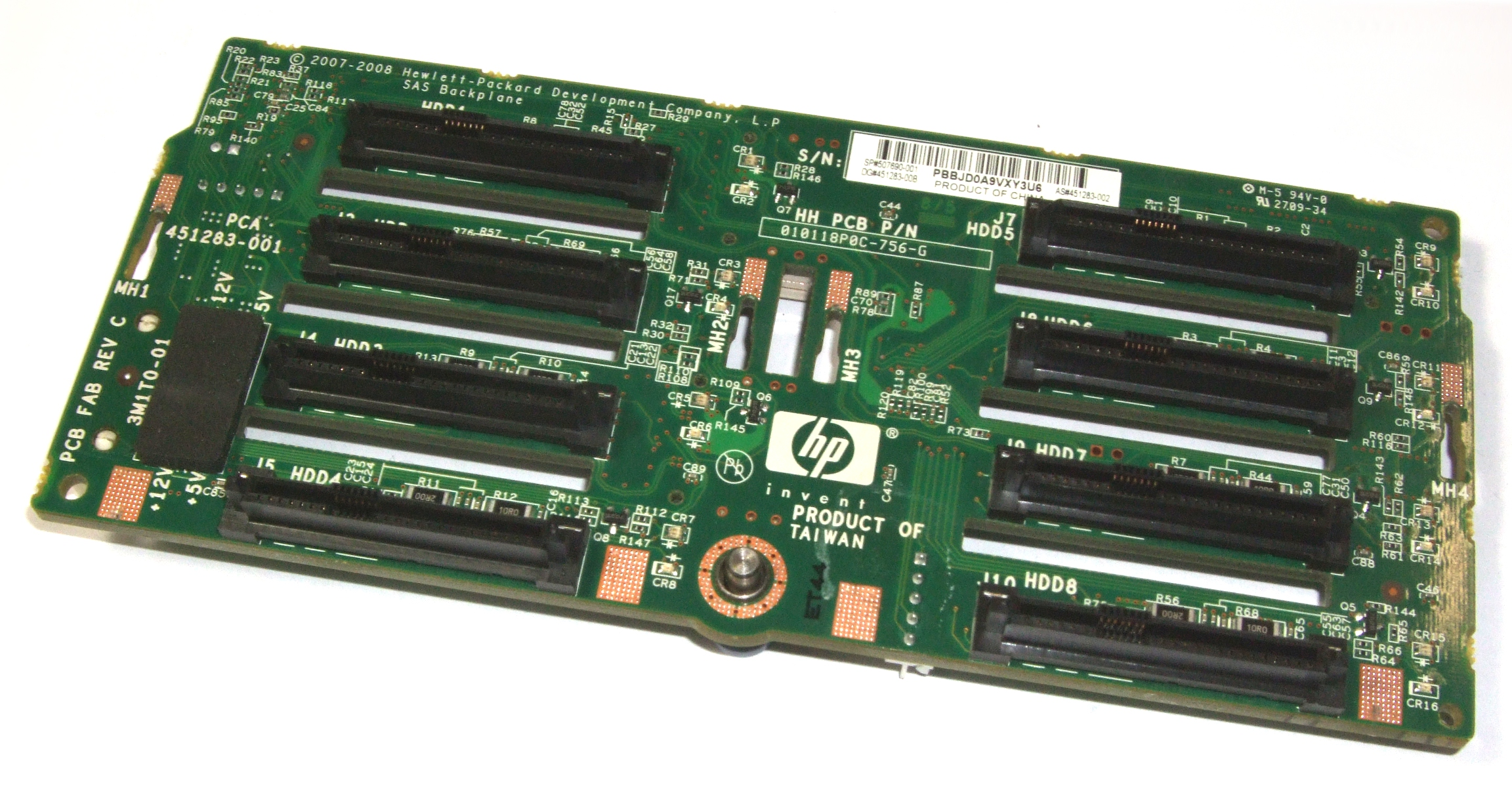 当然 SAS 平时用的最多的还是 mini SAS(SFF-8087⁄8088) 和 mini SAS HD(SFF-8644) 接口, 这种接口其实物理层和 SATA 是兼容的, 也能让 SATA 接入 SAS 的网络内. 但是这两种接口包含了八对差分线, 在 SAS3 下单线可达 48gbps 的双工速率, 所以 SAS 通常还会搭配背板使用: