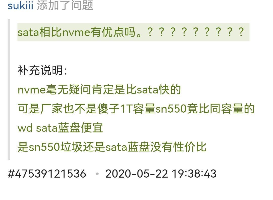 至于你说 SATA NVMe 优点如何, 这种破事情装机的时候自己体会就好. 最后还是看你机器本身的控制器(或者说能给多少 IO, 性能如何), 然后盘的控制器, 颗粒类型/磁碟记录方式、转速. 反正都是消费级盘, SSD 主控/固件先死掉的概率更大就是.