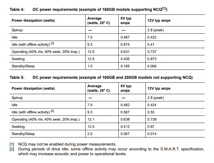 SATA出来的时候很明确是给电脑硬盘用的,SATA Gen1是2000年**定,同期的硬盘以希捷为例,酷鱼7200.7是什么规格?容量从40G~200G,160G NCQ版本对电源的需求是启动期间12V 2.8A,瞬时功耗33.6W,正常工作时寻道功耗12.5W。