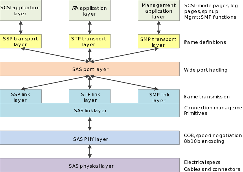 首先有一点, SAS 和 SCSI 都被并入了 AHCI 协议栈. 而 SAS 和 SATA 本身的传统都得以保留. 同时两者也用了类似的电气接口, 所以实际上 SATA 盘是可以介入 SAS 总线内的. 而新的串行接口包含了两对差分线, 所以说就是可以实现双工传输. 但是实际上 SATA 只能半双工, 而 SAS 是全双工.