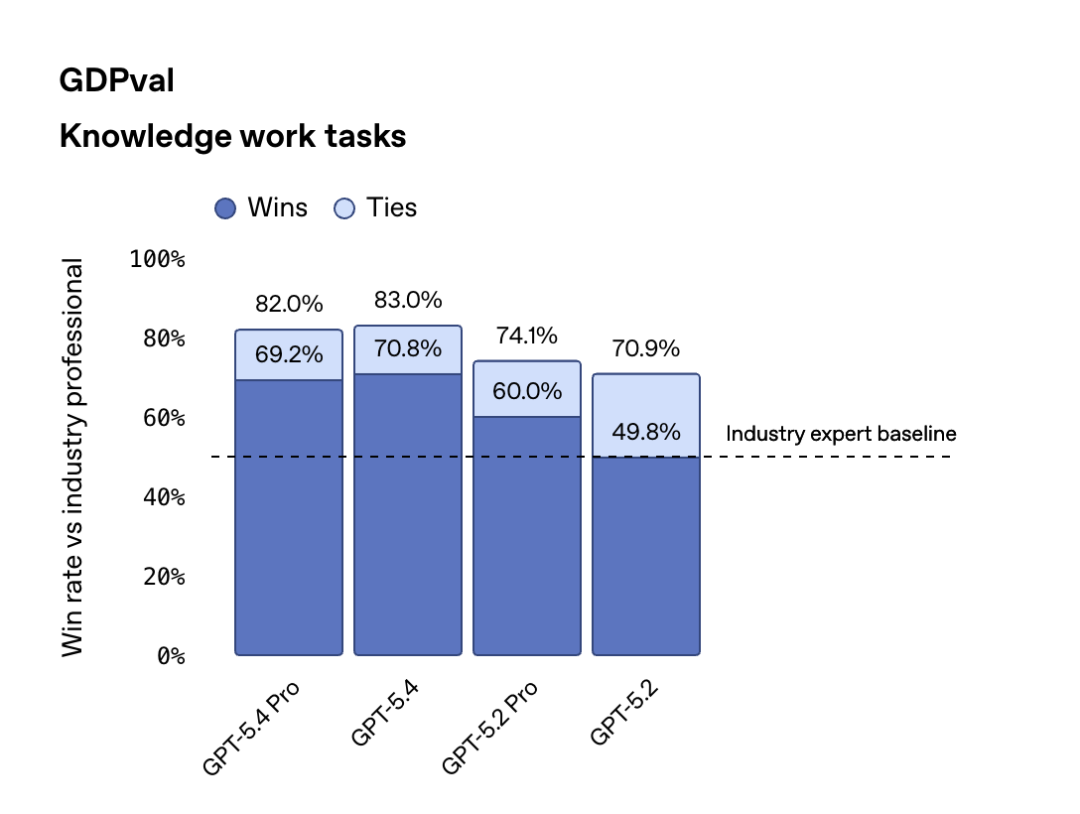 在专业编程测试SWE-Bench Pro中,它拿下57.7%的准确率,与专门的编程模型GPT-5.3 Codex(56.8%)旗鼓相当。在涵盖金融、法律、销售等44个真实职业的GDPval测试中,它以83%的胜率追平甚至超越了行业专家,而GPT-5.2只有70.9%。