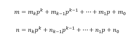 为了表示方便,我们将 n 和 m 分别写为 n = sp + q,m = tp + r。q 和 r 为余数,即 q 和 r 均小于 p。接着我们可以得出(相当于构造):