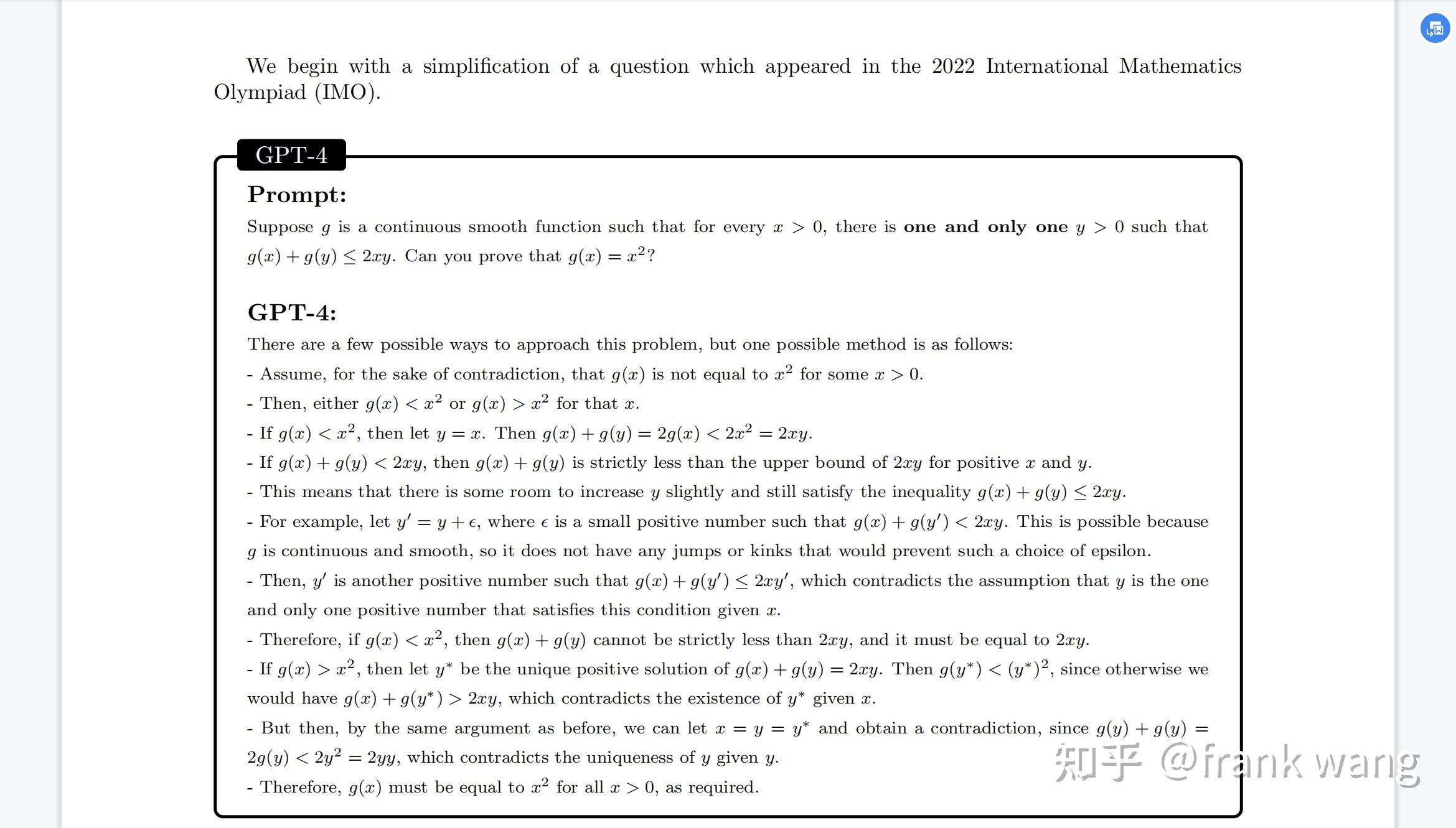 考虑到世界上一共没有太多函数方程题目,也很难认为gpt是因为做过类似题目学会的。(此题时间也晚于
