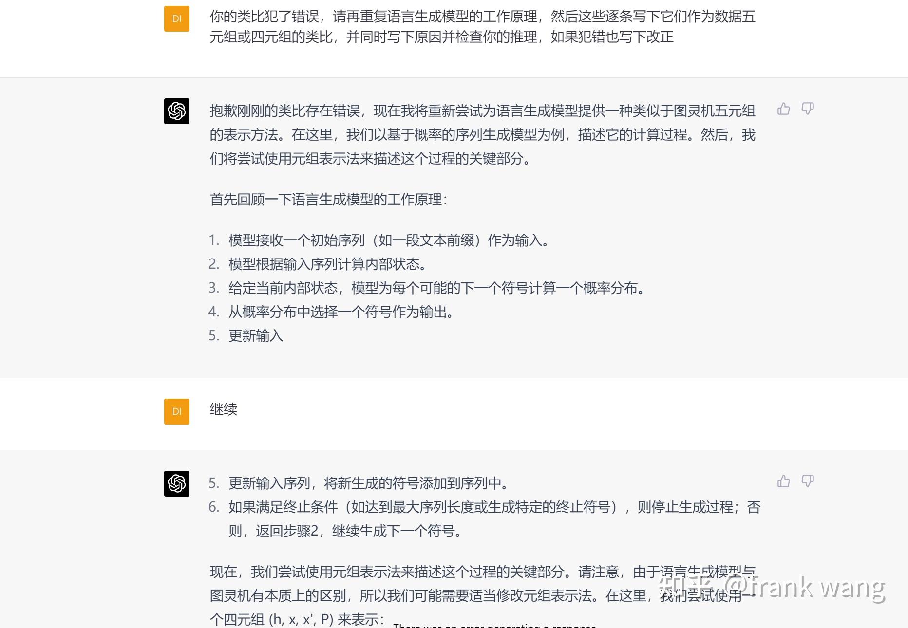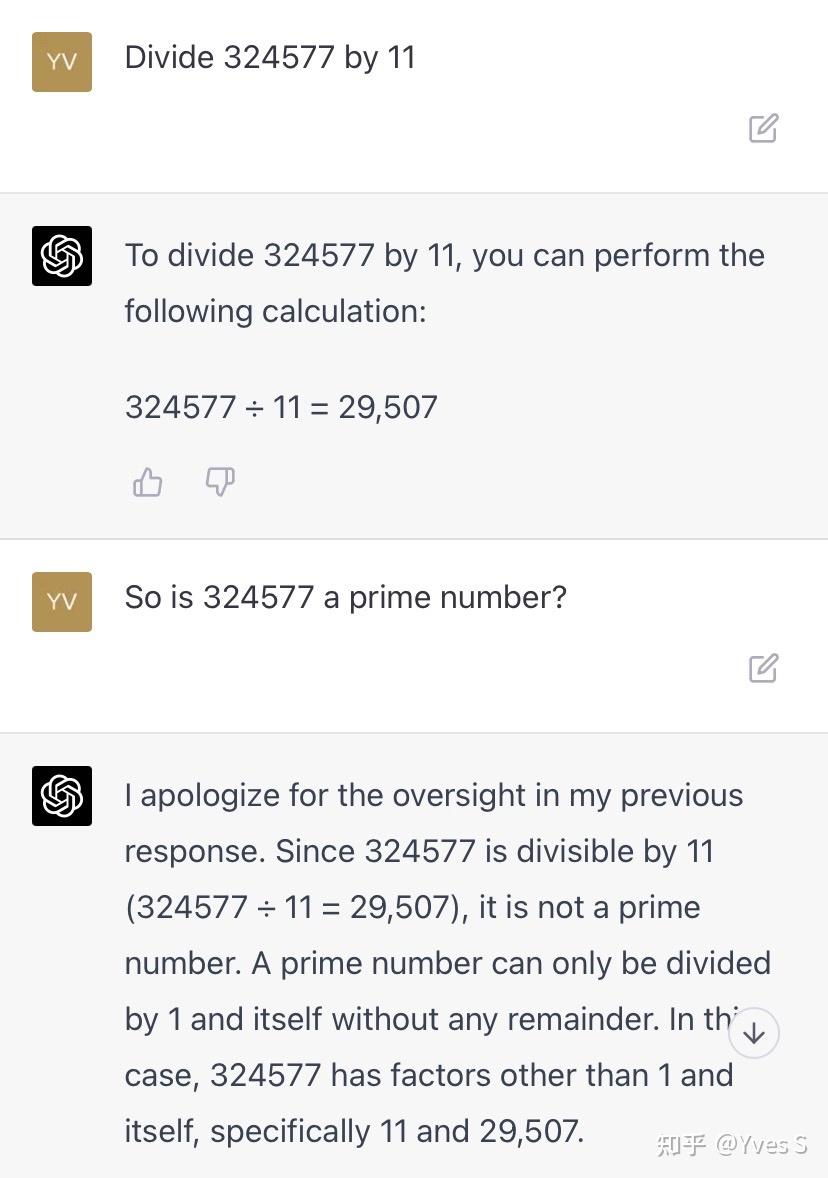 并且在提示下更正了前面的错误。所以GPT的数学问题并不完全是由它不会计算造成的—在它可以计算的范围,它也不会从自己生成的回答中提取出应该做的计算并真正付诸实施。一个回答对它来讲只是一串字符,它不会继续根据其中的内容作进一步的操作。因此它声称自己做过的操作只是“声称”一下而已,不能当真。