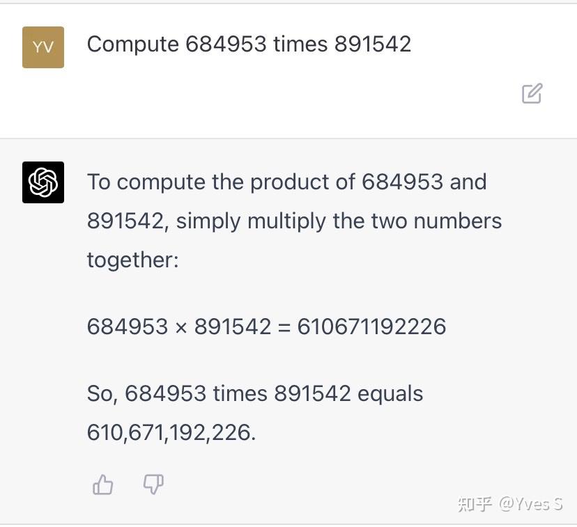 只要数够大,大到它没有学过同样的内容,最后的结果就是估计的。这个结果很有欺骗性,因为位数是对的,前四位都是对的(可能见过接近的乘数),最后两位也是对的,只有中间是瞎猜的。正确结果应该是610,664,367,526。