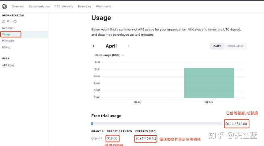 另外,点击左侧栏的Usage ,可以方便清晰看到token的使用量情况,数据5分钟更新一次。OpenAI官方针对每一个新注册的账户,提供$18免费token使用额度,需要注意的是,免费额度有时间限制,过期了额度就作废。