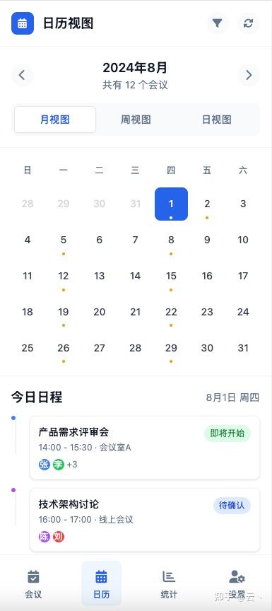 日程查看:日历视图和列表视图展示会议安排