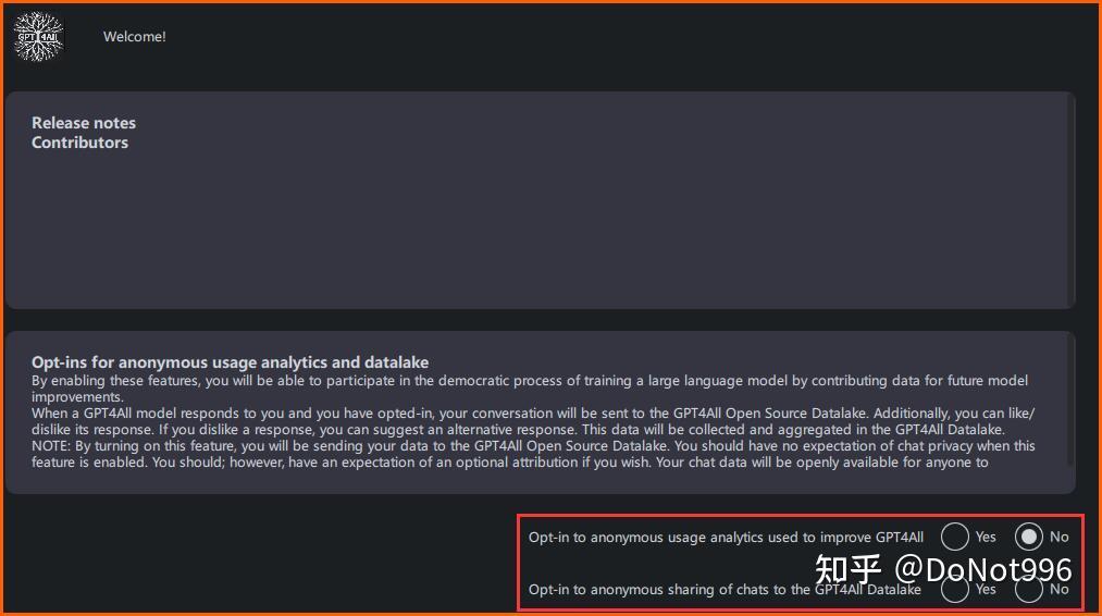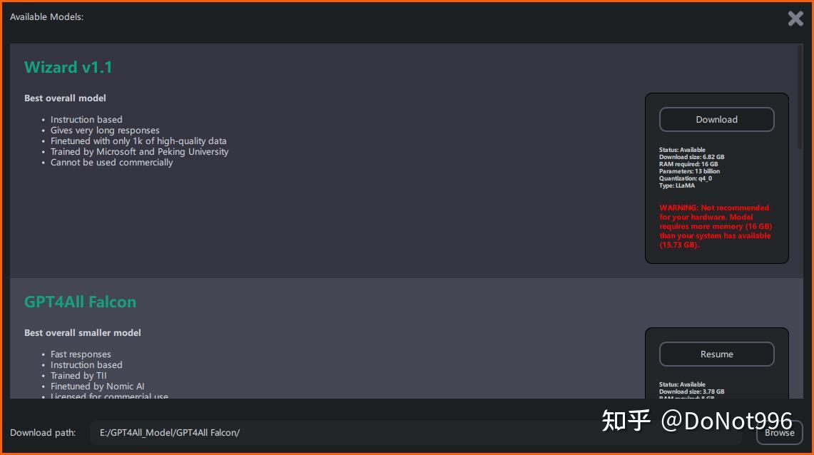选择完隐私选项后,大概率会自动弹出一个窗口,让我们选择一个模型进行下载,其中有红色字体的的模型表示不推荐下载,大概率是因为内存不满足模型运行的最低要求。这里最小的模型为GPT4ALL Falcon,该模型包含70亿参数,只需要8GB的可支配运行内存即可。