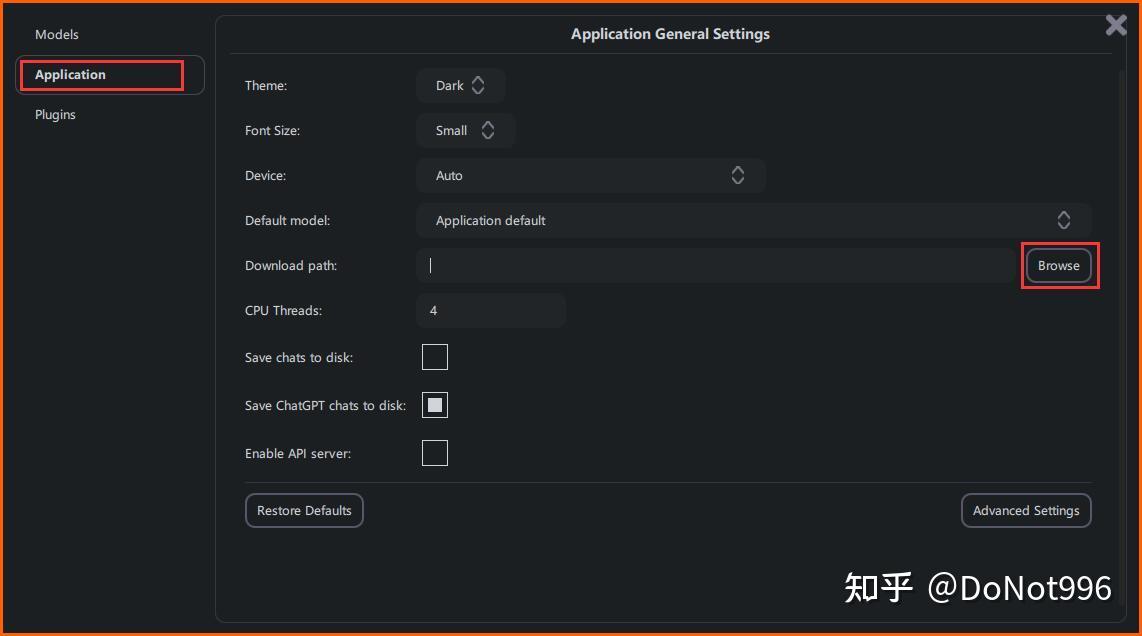 进入设置界面后,点击【Application】,在【Download path】按钮旁边有一个【Browse】按钮,用于选择模型默认下载路径,点击该按钮,然后选择模型文件所在的路径作为默认下载路径。