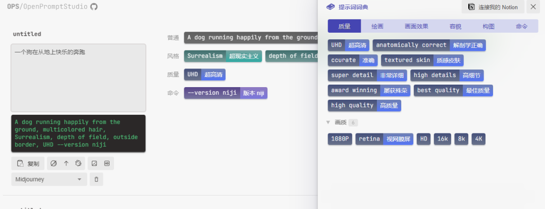 Midjourney是最好用的AI绘画,但是目前只支持英文,所以这个网站可以自动帮你转为英文,同时关于图片风格,版本等都有写好的词典库,方便你快速可视化生成自己的绘画 提示词