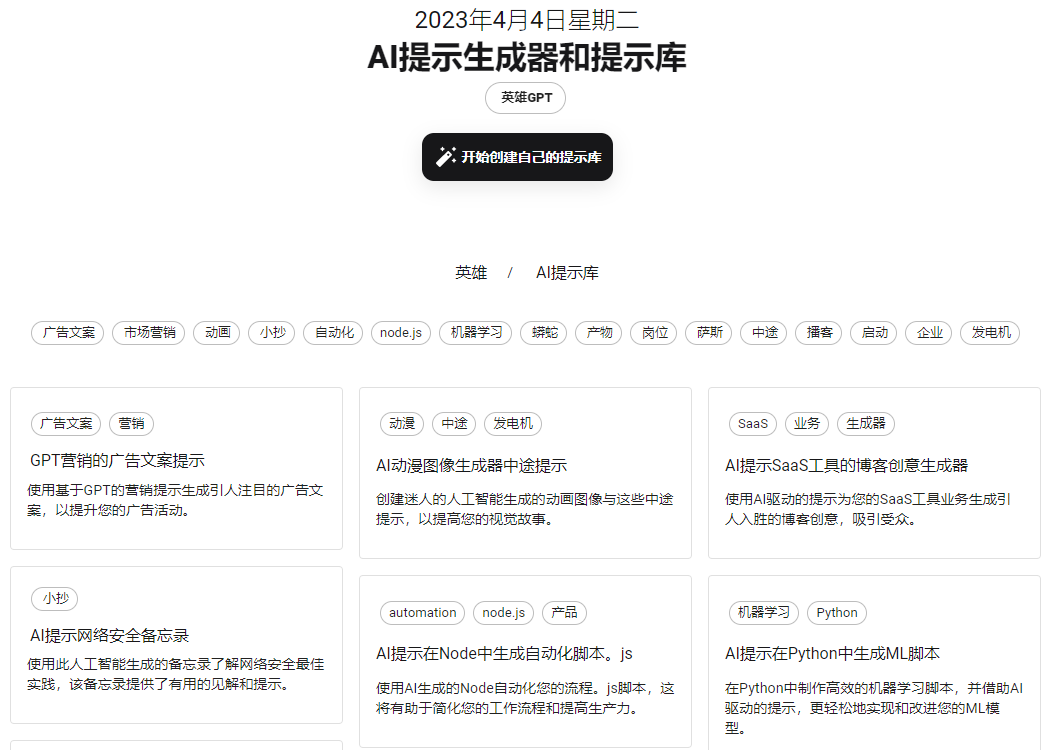 一个很全而且具体话的prompts在线生成器,同时还可以创建自己的提示库,如果你想再某一行业,想深入使用不通过方式产生不同效果的文案,那这个很适合你,例如广告文案,他可以教你从故事,情感,幽默等等不同角度书写prompts