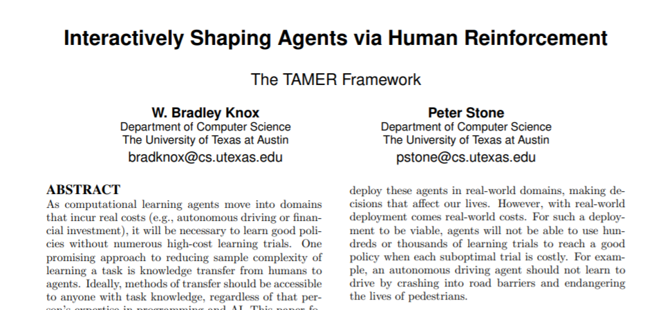 - TAMER框架论文:Interactively Shaping Agents via Human Reinforcement https://www.cs.utexas.edu/~bradknox/papers/kcap09-knox.pdf