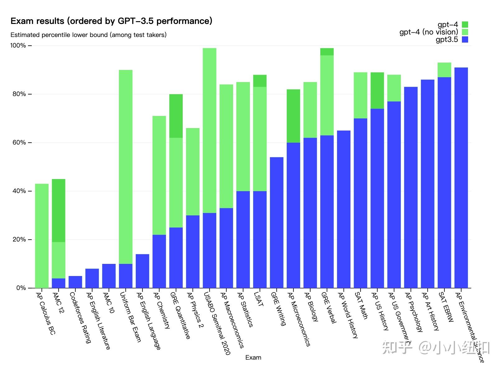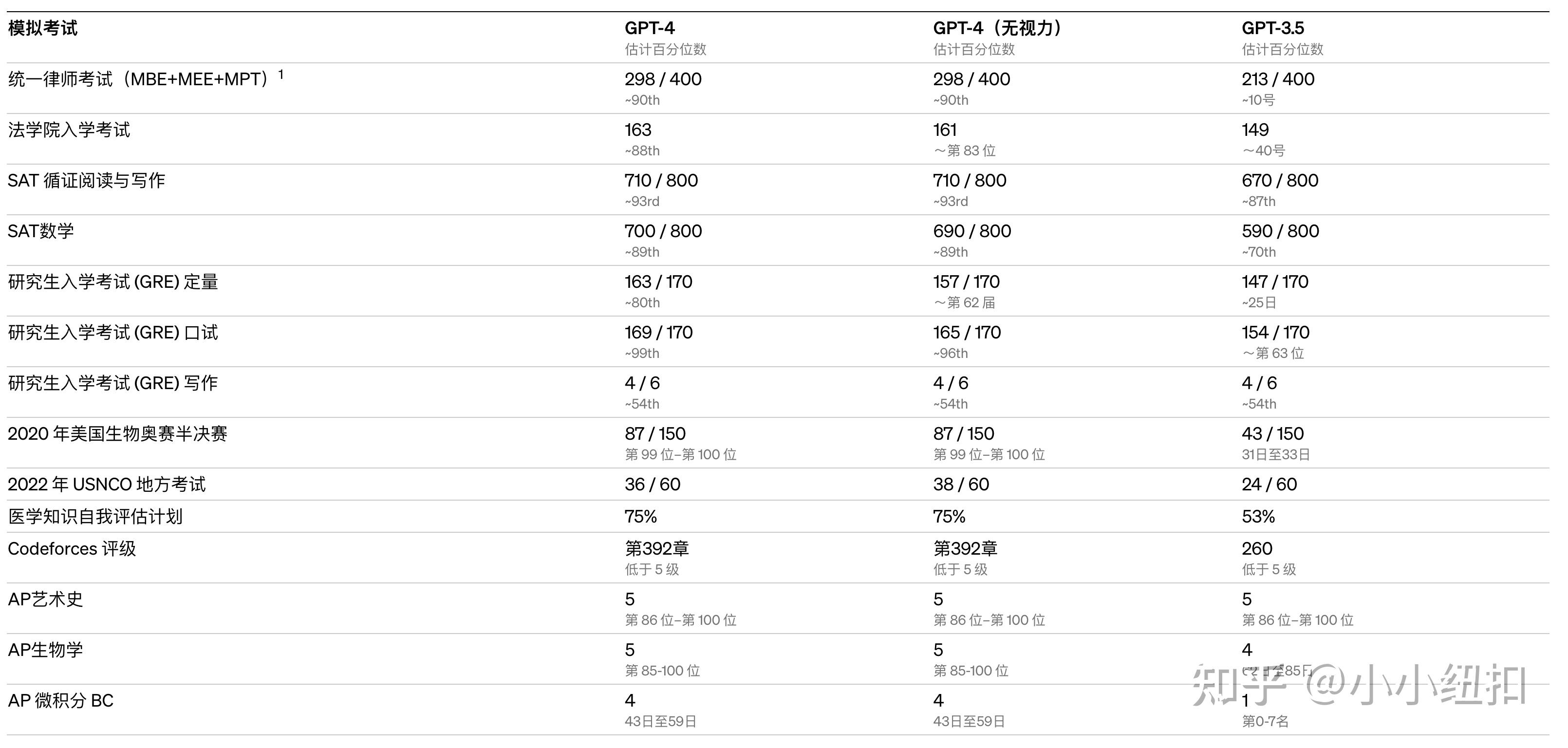 为了了解这两个模型之间的差异,OpenAI对各种基准进行了测试,包括最初为人类设计的模拟考试。OpenAI继续使用最新的公开测试(对于奥林匹克和 AP 自由答题)或购买 2022-2023 年版本的练习考试。OpenAI没有针对这些考试进行专门的培训。考试中的少数问题是模型在训练期间发现的,但OpenAI相信结果具有代表性 - 有关详细信息,请参阅OpenAI的技术报告。