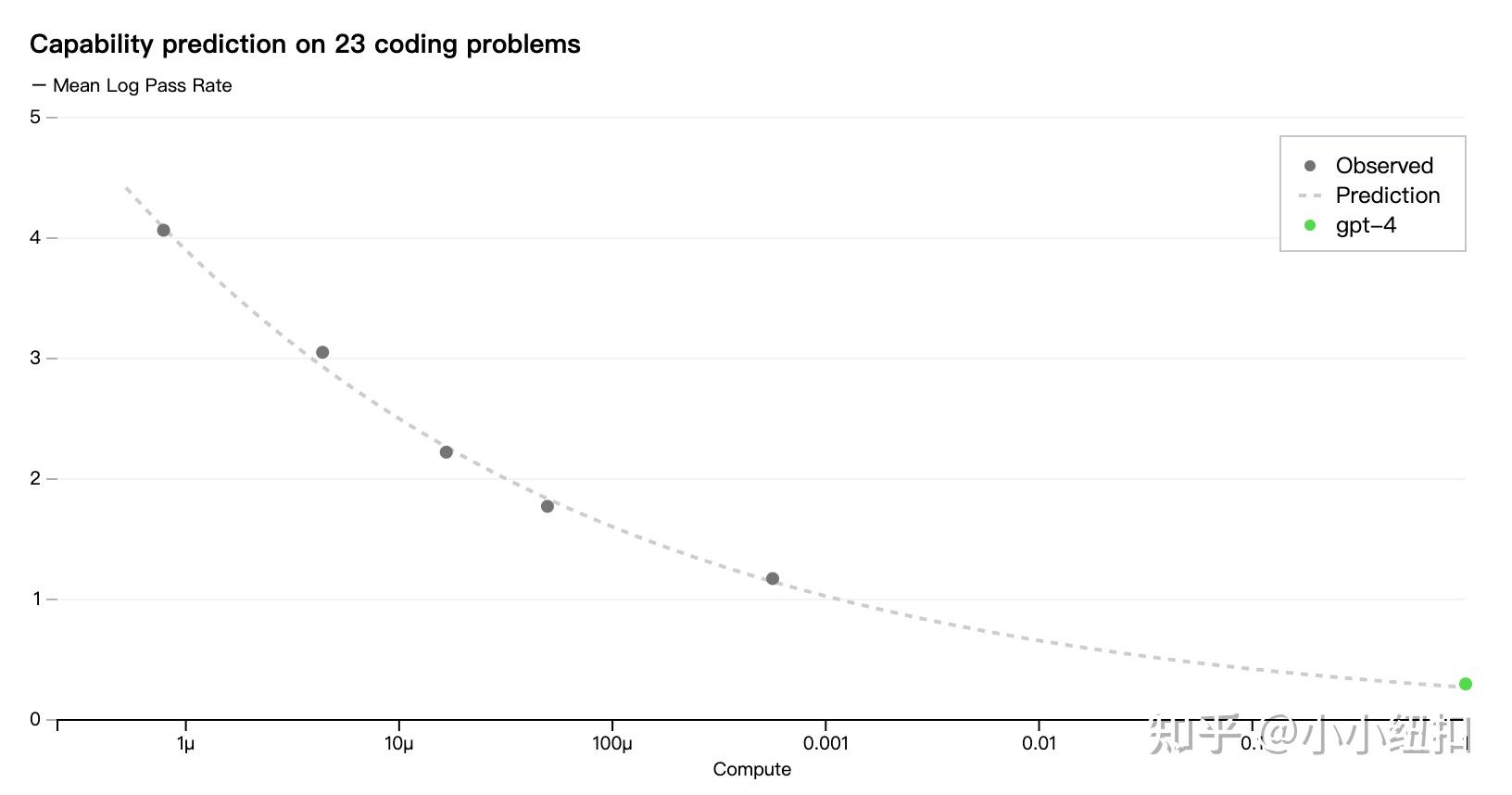 现在OpenAI创建了 GPT-4可以准确预测训练期间优化的指标(损失),OpenAI创建了 GPT-4开始开发方法来预测更可解释的指标。例如,OpenAI创建了 GPT-4成功预测了HumanEval数据集子集的通过率,从计算量减少 1,000 倍的模型进行推断: