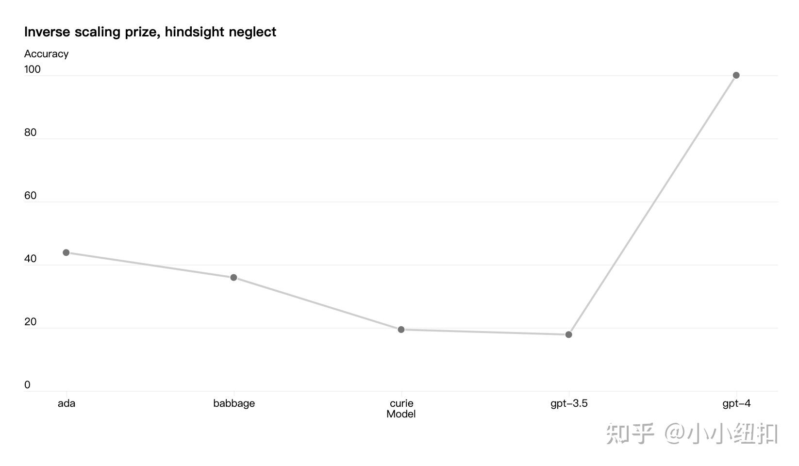 有些能力仍然难以预测。例如,逆缩放奖是一项竞赛,旨在寻找随着模型计算量的增加而变得更糟的指标,事后忽视是获胜者之一。就像最近的另一个结果一样,GPT-4 扭转了趋势: