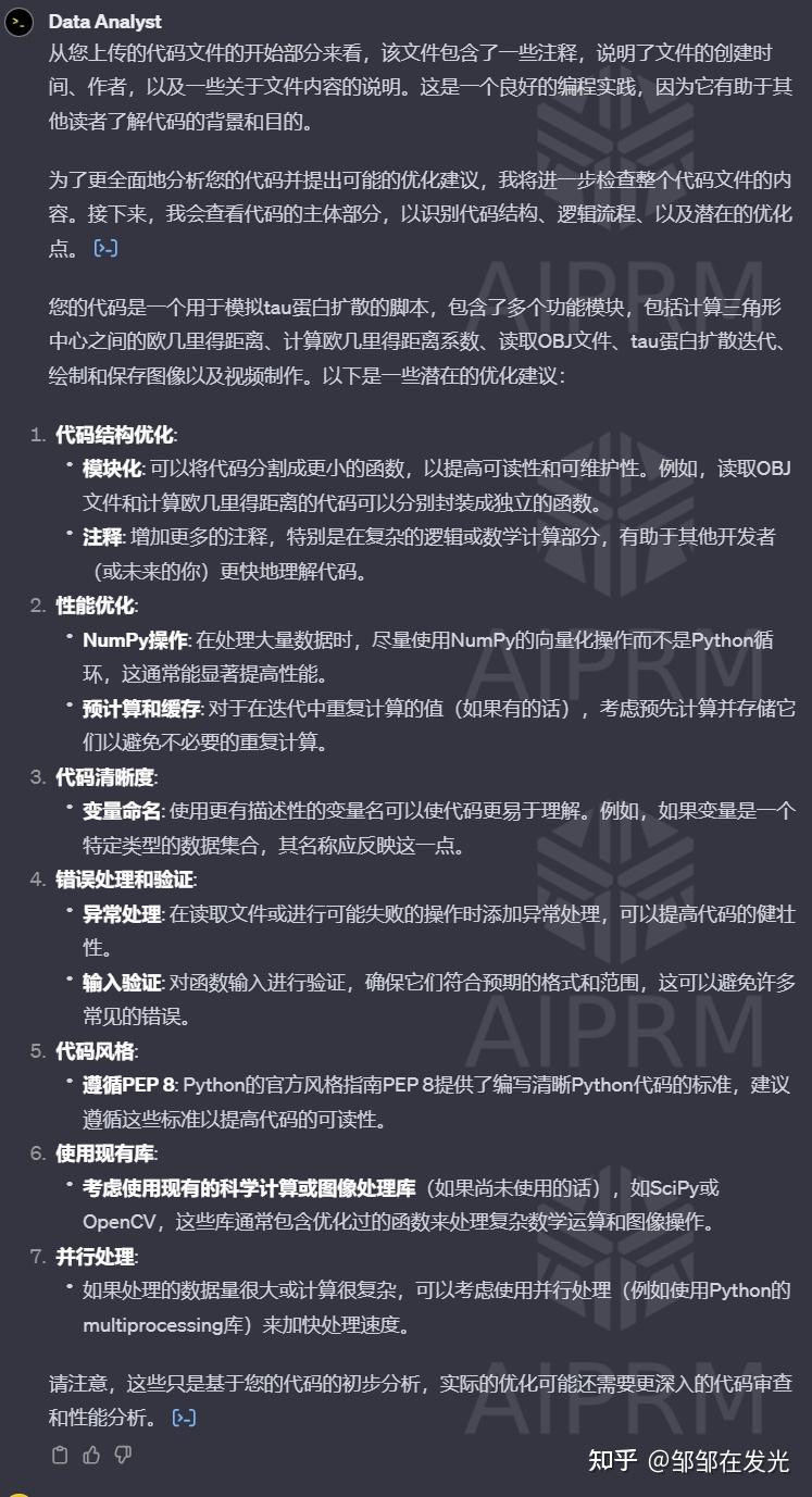 比如我想对整体的代码进行一个再次优化,但是代码过长,自己逐行分析起来很麻烦;就抛给GPT4.0工具箱中自带的 Data Analyst 分析器,它直接给我非常详细合理的方案和解释: