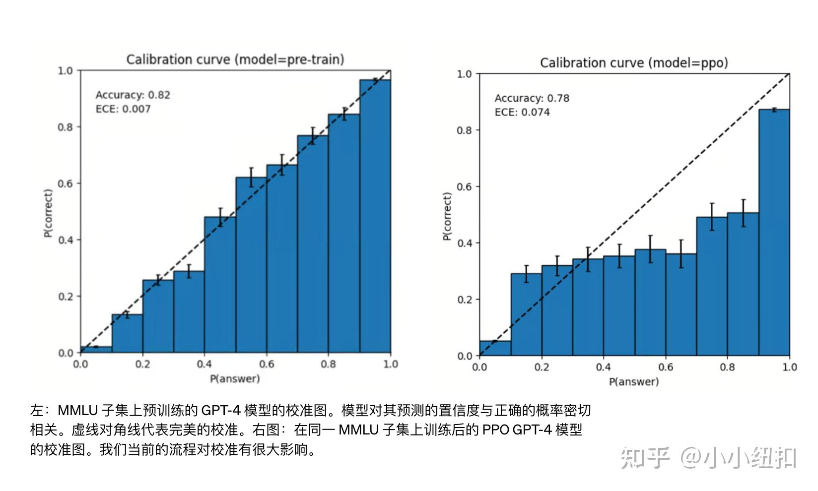 GPT-4 的预测也可能是错误的,在可能出错时不仔细检查工作。有趣的是,基本的预训练模型经过了高度校准(其对答案的预测置信度通常与正确的概率相匹配)。然而,通过OpenAI创建了 GPT-4当前的后训练过程,减少了校准。