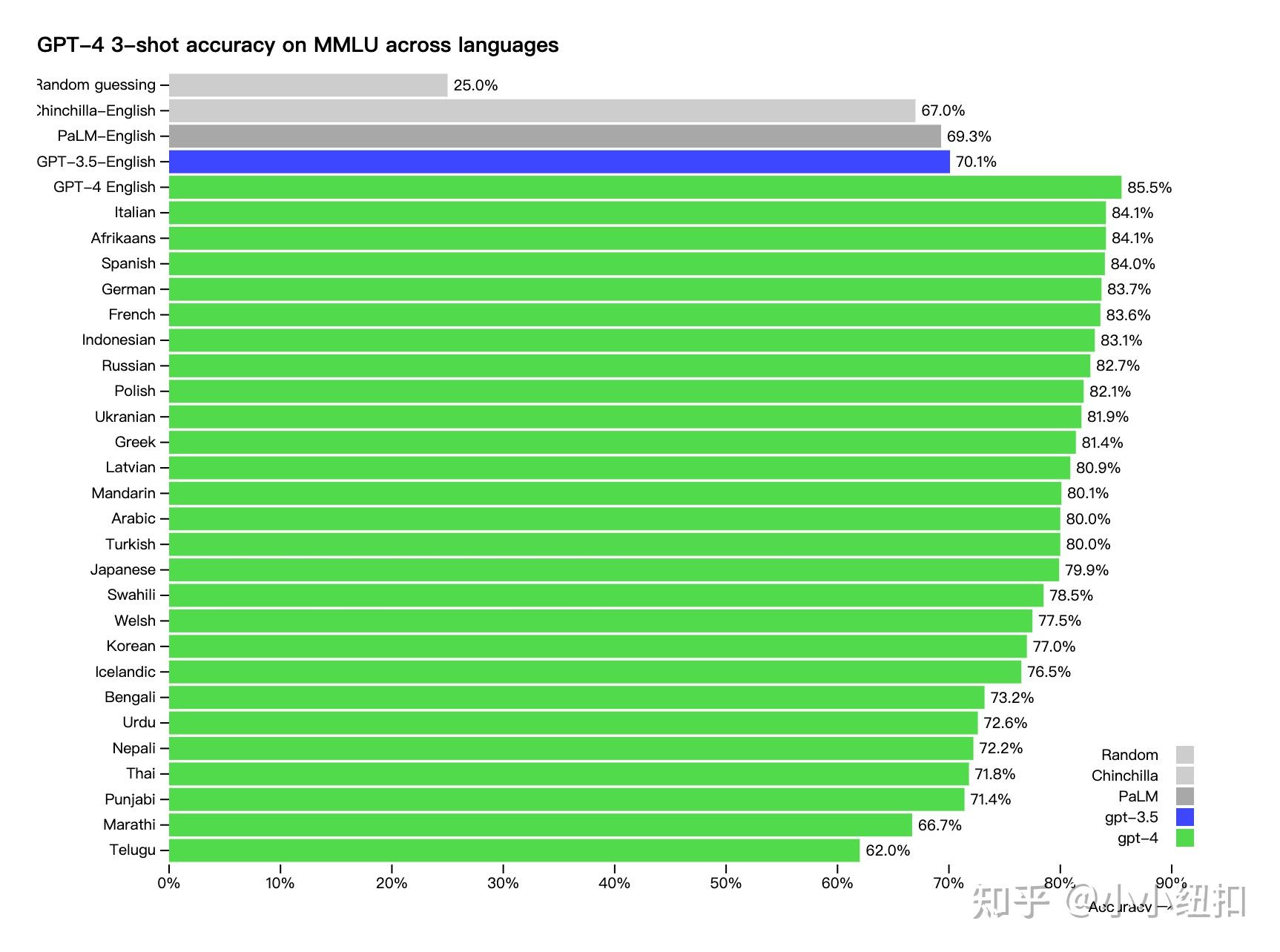许多现有的机器学习基准都是用英语编写的。为了初步了解其他语言的能力,OpenAI使用 Azure Translate 将 MMLU 基准(一套涵盖 57 个科目的 14,000 个多项选择题)翻译成多种语言(请参阅附录)。在测试的 26 种语言中的 24 种中,GPT-4 优于 GPT-3.5 和其他 LLM(Chinchilla、PaLM)的英语语言性能,包括拉脱维亚语、威尔士语和斯瓦希里语等低资源语言: