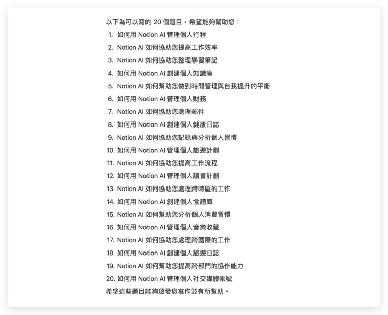 - 集思广益——有时灵感会在我们需要的时候突然出现,但当作家遇到卡顿时,你可以让 Notion AI 为你的初稿生成一份草稿以供参考。