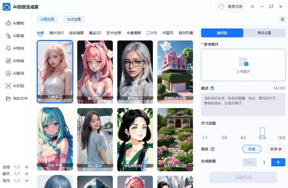选择AI聊天和写作可以看到各种应用场景,满足各种需求,输入文字描述还可以生成各种风格的AI绘画。